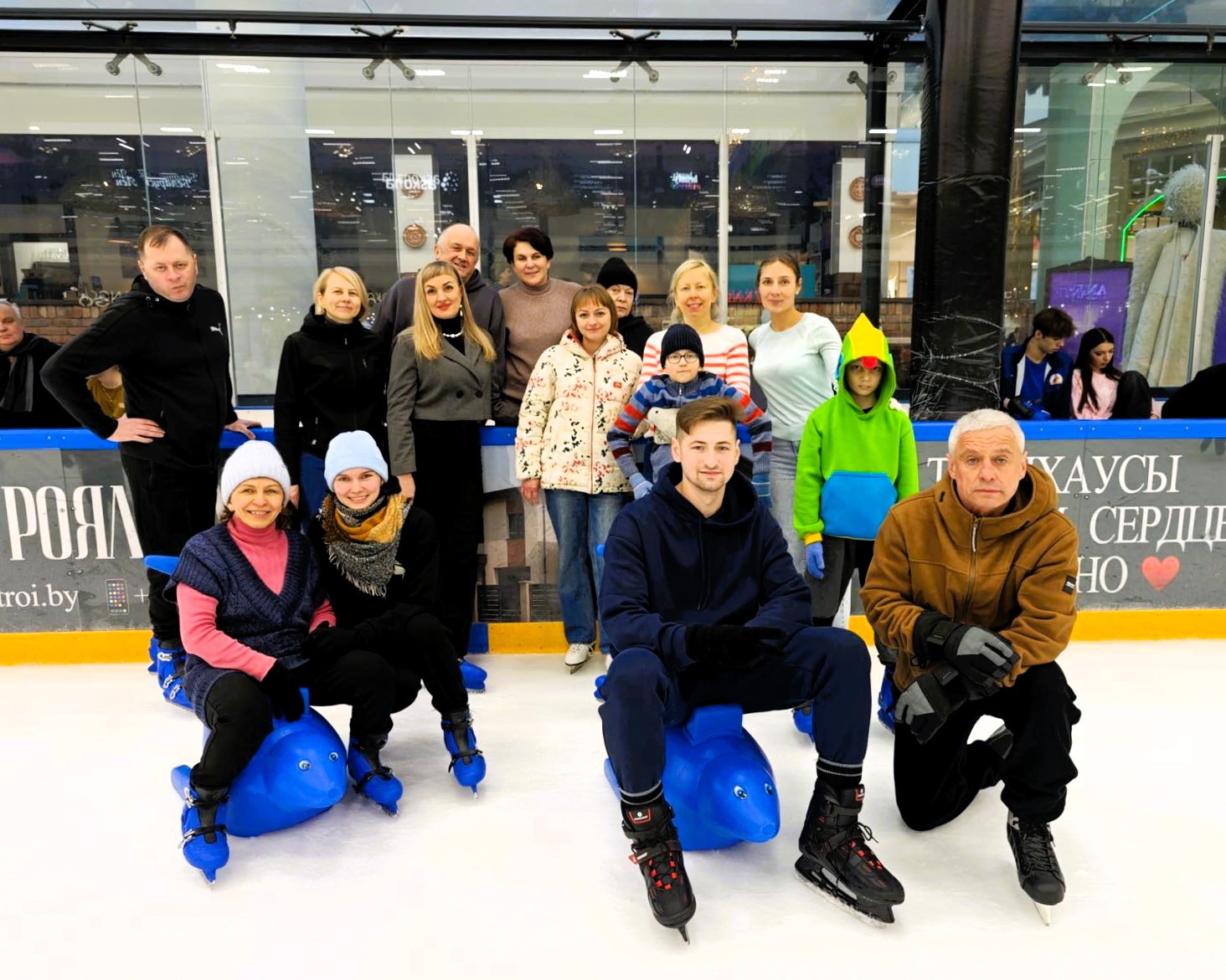 На лед торгового центра Triniti вышла дружная команда любителей активного отдыха, многие пришли вместе с семьями.