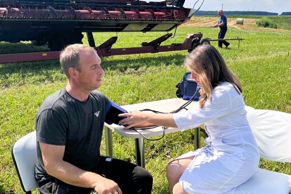 В условиях напряженного сельскохозяйственного труда врачи выезжают непосредственно на производственные участки, чтобы своевременно выявить признаки недугов или перегрева и в случае необходимости оказать помощь.