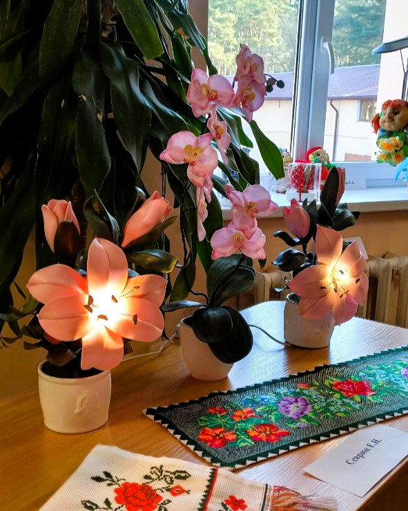 Филигранно вышитые картины, изящные плетеные изделия и удивительной красоты рукотворные цветы стали свидетельством того, что за строгим профессионализмом медицинских работников и административного персонала скрываются тонкие, творческие натуры.