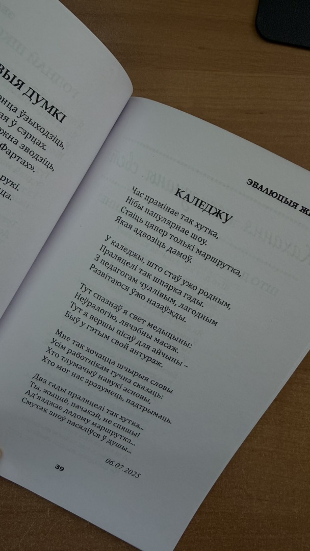 Он рассказал, как совмещает медицинскую практику с литературным творчеством и прочитал собственные стихи. В сборник вошли лирические и философские тексты, в том числе о годах учебы в колледже. Интересно, что в творческом багаже молодого медика есть и стихотворение к 120‑летию профсоюзного движения Беларуси.